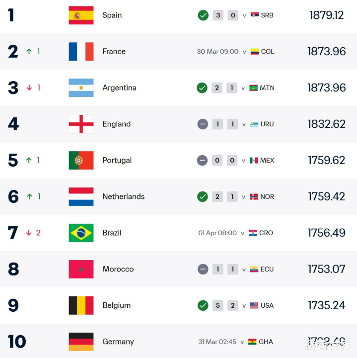 另一项出人意料的变动是:阿根廷从第 2 跌至第 3,被法国队超越。尽管阿根廷在友谊赛中 2-1 战胜毛里塔尼亚,但面对实力偏弱的对手仅小胜,不足以保住原有排名。
